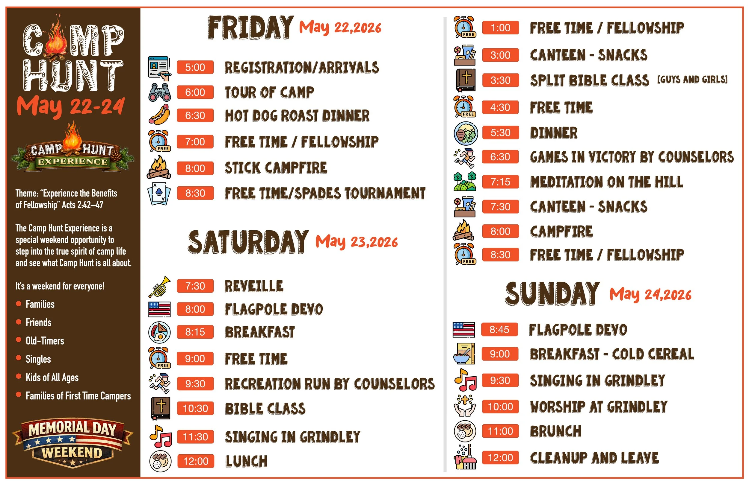Participants will spend the weekend enjoying the outdoors, building friendships, and experiencing the traditions that make Camp Hunt special. You can follow along with the camp schedule or choose to do your own thing and experience camp at your own pace.
